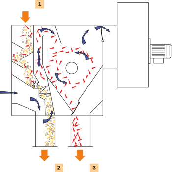 Il prodotto entra per gravità in un distributore a rullo motorizzato e viene uniformemente distribuito su tutta la sua larghezza; successivamente, con discesa a velo, viene investito da un flusso d'aria trasversale che asporterà le parti più leggere, (decantate da un ciclone o filtro) depositando una parte di polveri più pesanti nella tramoggia di decantazione dalla quale uscirà per gravità.