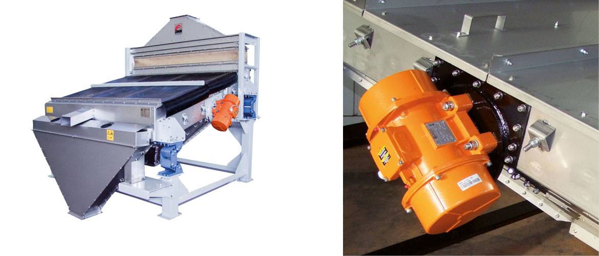 Il prodotto entra per gravità in una tramoggia dosatrice e viene uniformemente distribuito su tutta la sua larghezza.